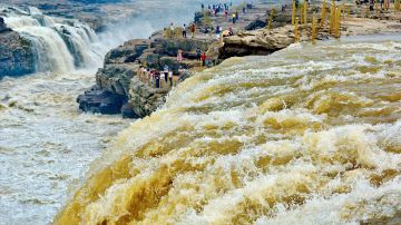 黄河壶口瀑布位于秦晋大峡谷黄河河床中,瀑布以东是山西临汾地区,以西是陕西延安宜川县,壶口瀑布陕西处,位于延安市宜川县城以东约35公里处。由于黄河水携带很多泥沙,这里成为了世界上少见的金黄色瀑布。