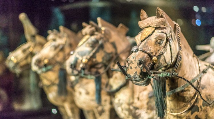 秦始皇兵马俑博物馆里有一座秦始皇帝陵文物陈列厅,在陈列厅里展出的大量出土文物当中,重量级的国宝当属造型逼真、制作精巧,被誉为世界“青铜之冠”的两乘大型彩绘铜车马。